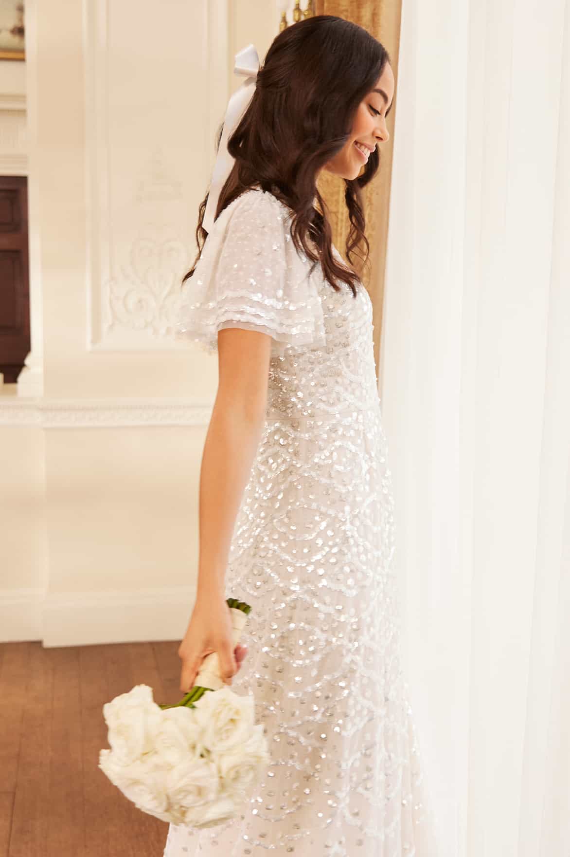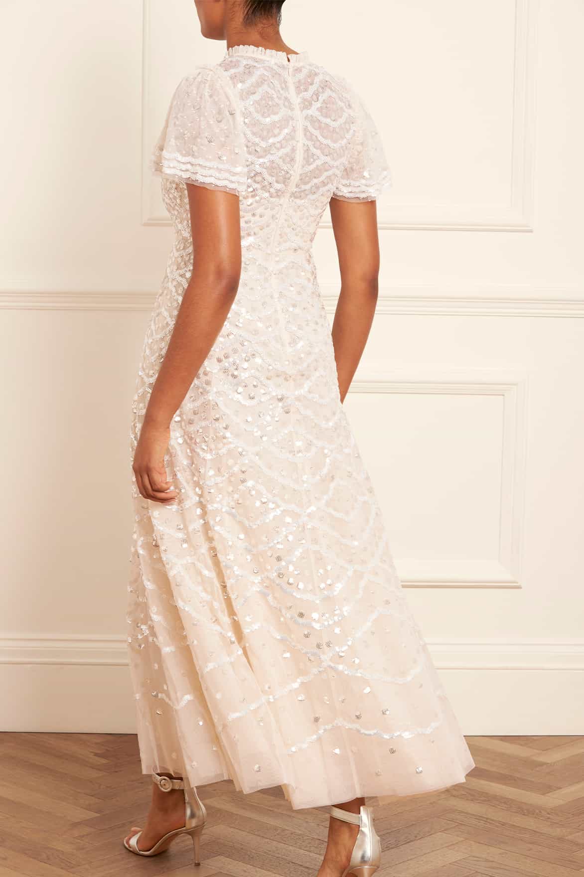 The Deco Dot Gloss Ankle Gown in Cream. This style has an artwork inspired by 1930¡¯s art deco styling. Developed with layered tulle sleeves and a sequin border edge for 1930¡¯s romantic styling. The perfect gown for an upcoming special occasion.