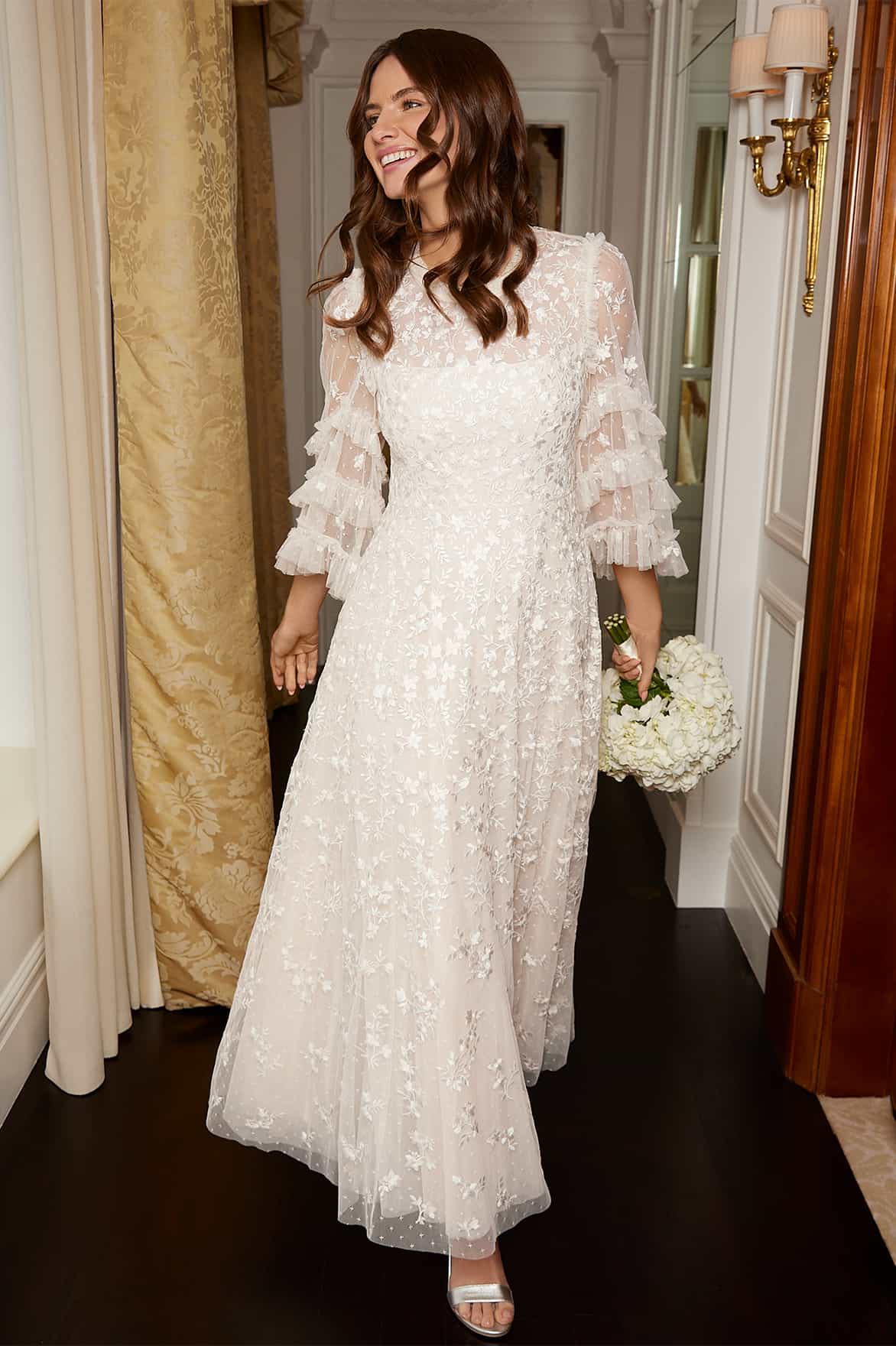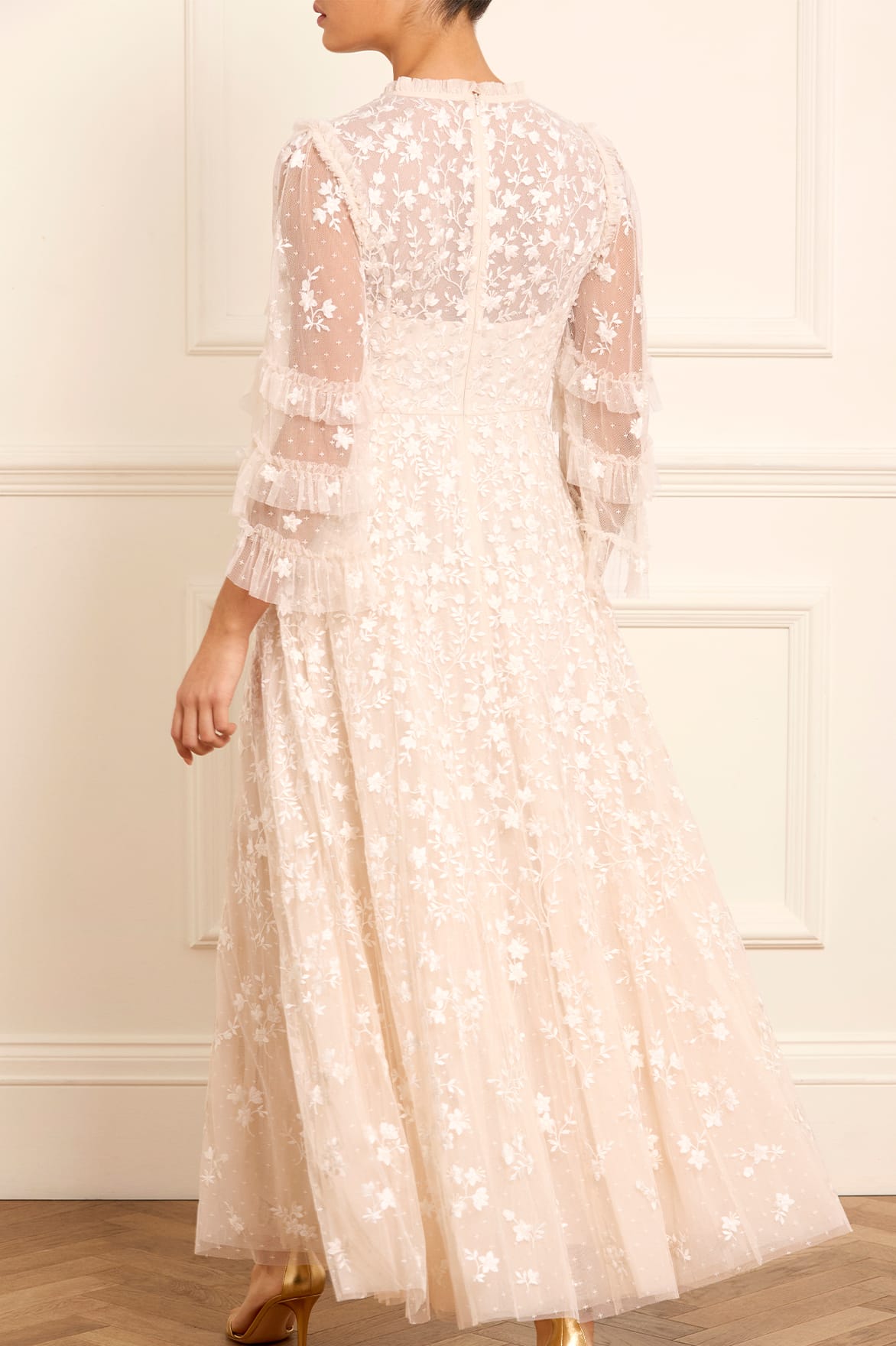 The Everett Bloom Round Neck Ankle Gown in Cream/Cream. This beautiful gown features exquisite, embroidered artwork inspired by a vintage archive print that showcases floating florals. Beautifully decorated with floral clusters cascading gently toward the hem, enhancing the romantic charm. Designed with fluted sleeves adorned with frothy tulle ruffles and embroidered floral motifs, while the neckline, shoulders, and cuffs feature signature Needle & Thread tulle frills for a touch of romantic elegance. The skirt is composed of generous layers of net and tulle, culminating in a sweeping hemline that adds to the gown's enchanting allure.