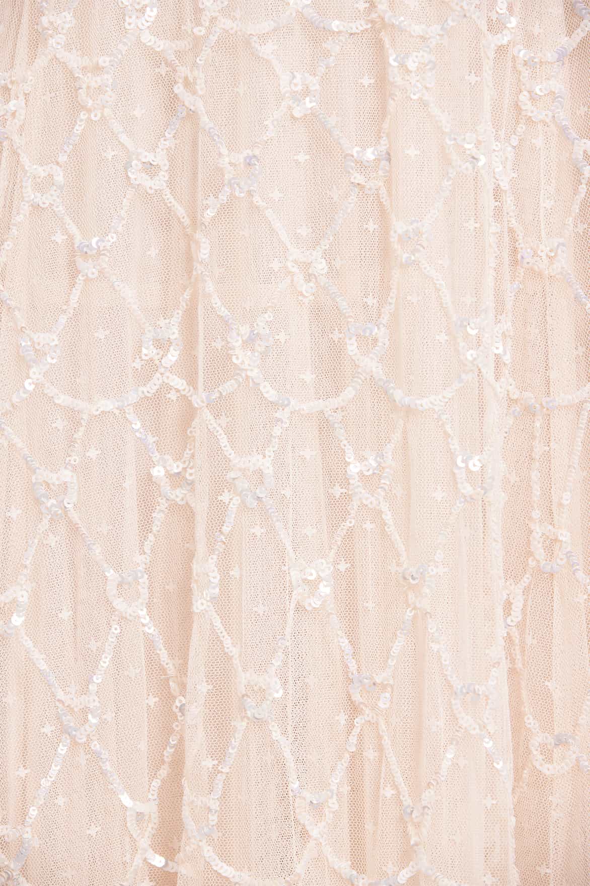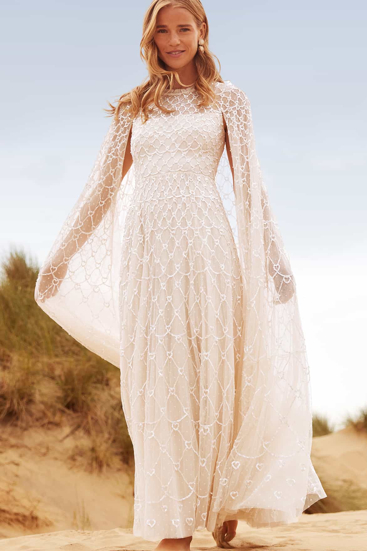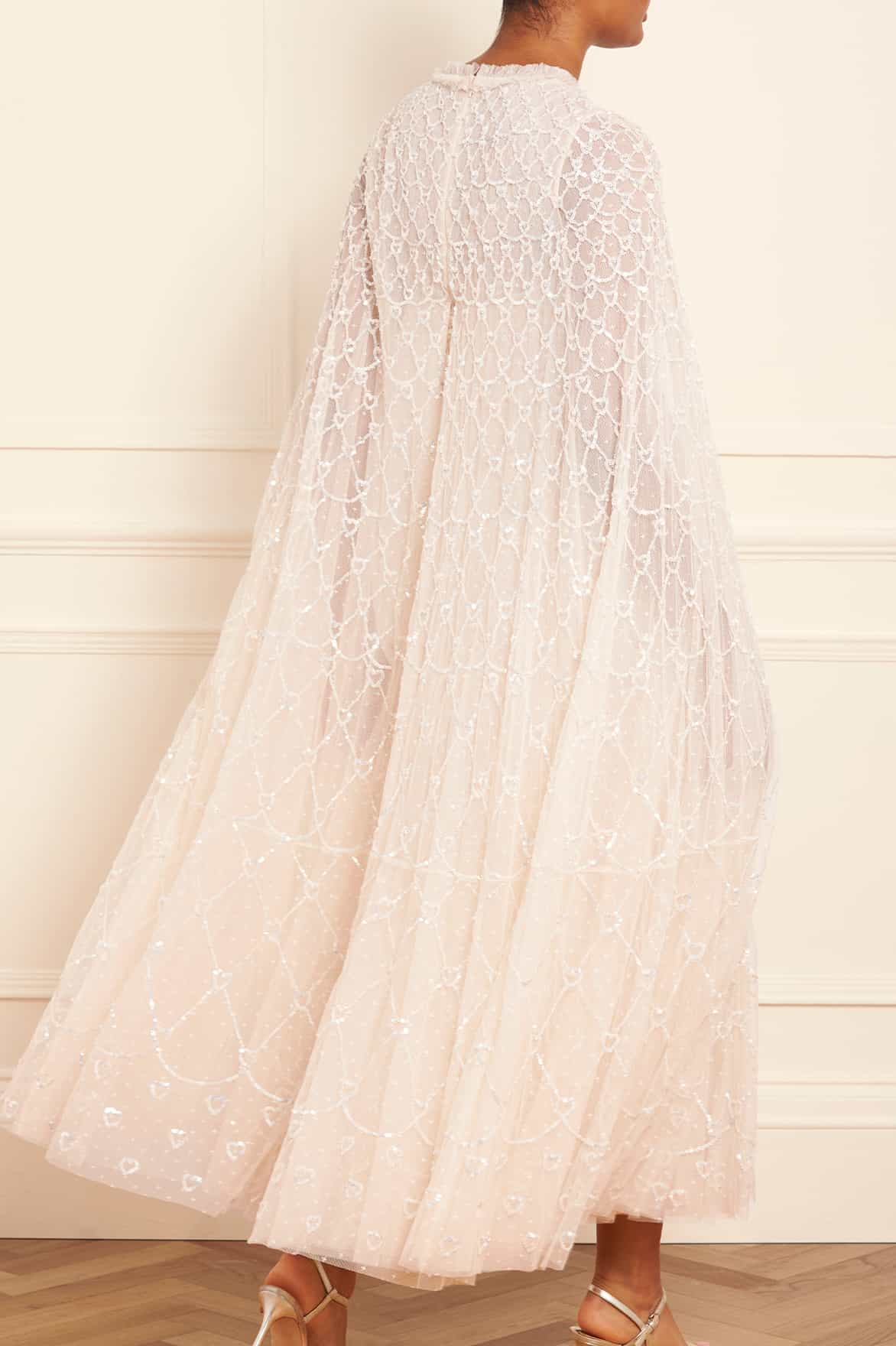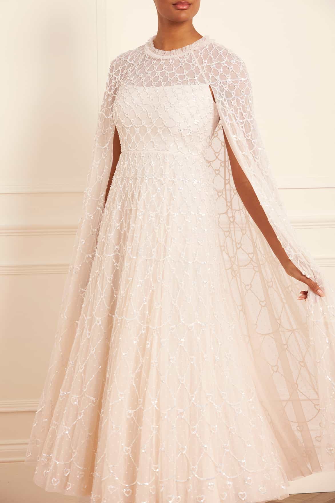 The Heart Lattice Ankle Gown in Cream. This gown is decorated with intricate embellishment made using the smallest sequins for exquisite detailing. Beautifully designed with heart-shaped motifs in a lattice layout. This gown features our new floor-length cape for romantic detailing and a statement look. Make an entrance at your next event.
