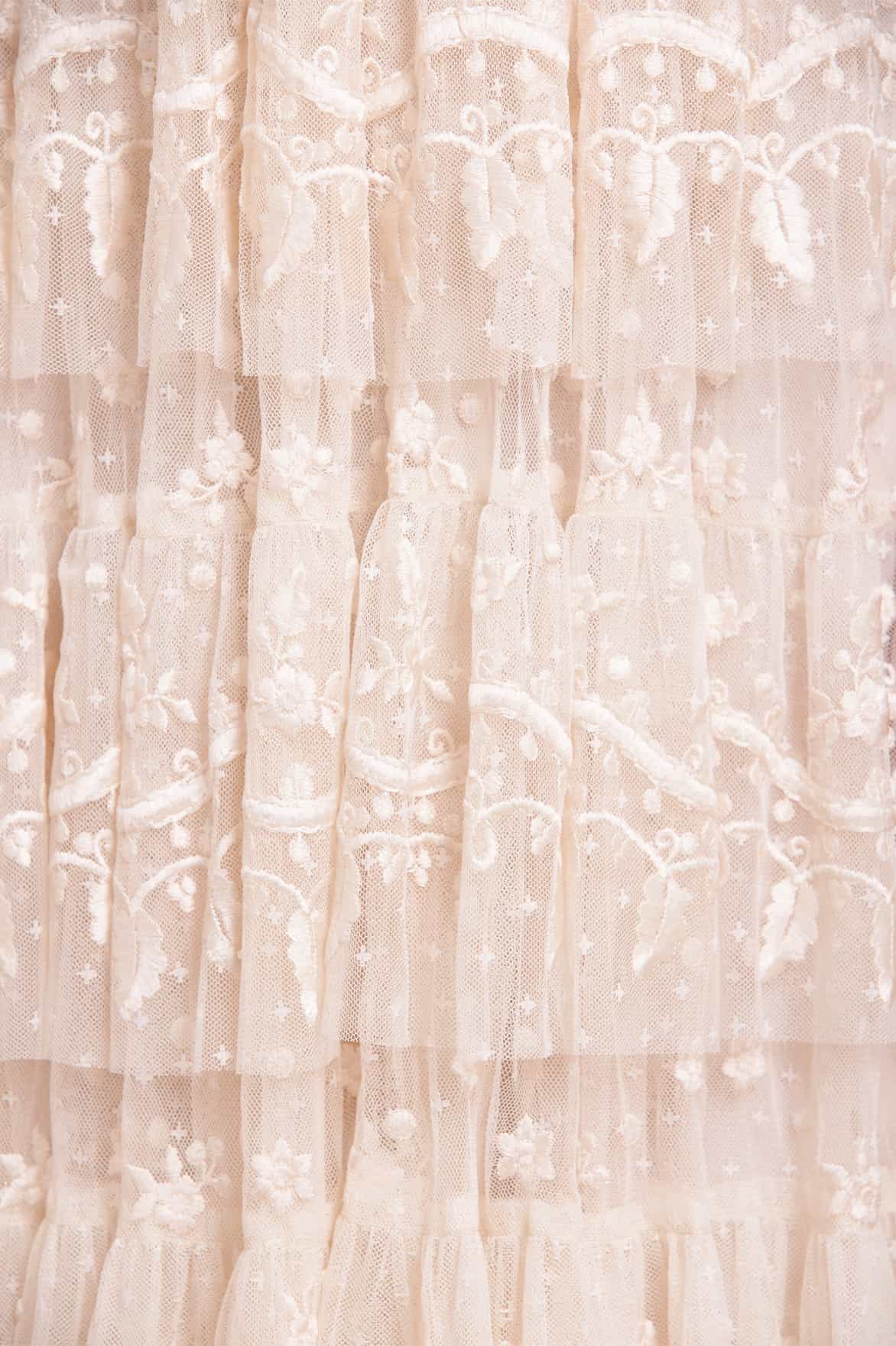 NEW SEASON. The Layered Lace Ankle Gown in Cream. This Needle & Thread heritage style features exquisite vintage lace-inspired embroidery with floral motifs and trailing leaf and ribbon designs. The flattering wrap front bodice is accented with signature tulle ruffles, while the puff sleeves with elasticated cuffs add a delicate touch. A tiered skirt, crafted from layers of soft tulle, completes the design, offering a romantic and elegant silhouette.