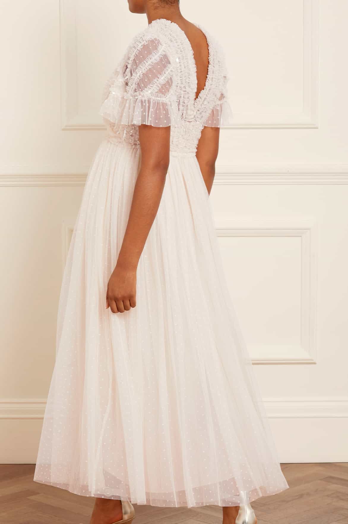The Spiral Sequin Bodice V-Neck Ankle Gown in Cream. A brand new style for the season ahead. This gown is elegantly designed with a V-neckline. Beautifully adorned with delicate tulle frills and a layered tulle skirt for a frothy, romantic texture. The bodice of the gown is designed with gathered, spiral texture and intricate, shimmering sequins adorning each individual frill. This gown is perfect for a bridesmaid moment or upcoming special occasion.