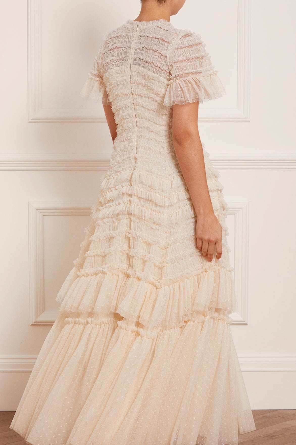 The Valentine Ruffle Gown in Champagne. A signature Needle & Thread style developed with textile ruffles and flattering tulle, creating a romantic look. The ruffles cascade down the dress, starting smaller and gradually getting bigger towards the hem to create soft, fluid movement. Crafted from our signature Needle & Thread kisses tulle. Make a statement in the Valentine.